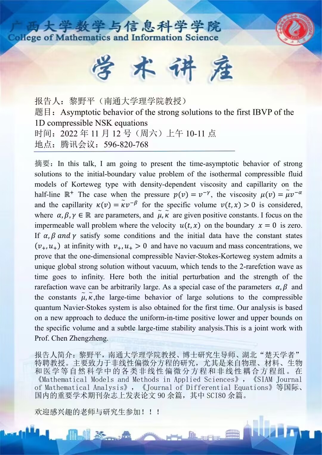 学术讲座: Asymptotic behavior of the strong solutions to the first IBVP of the 1D compressible NSK equations