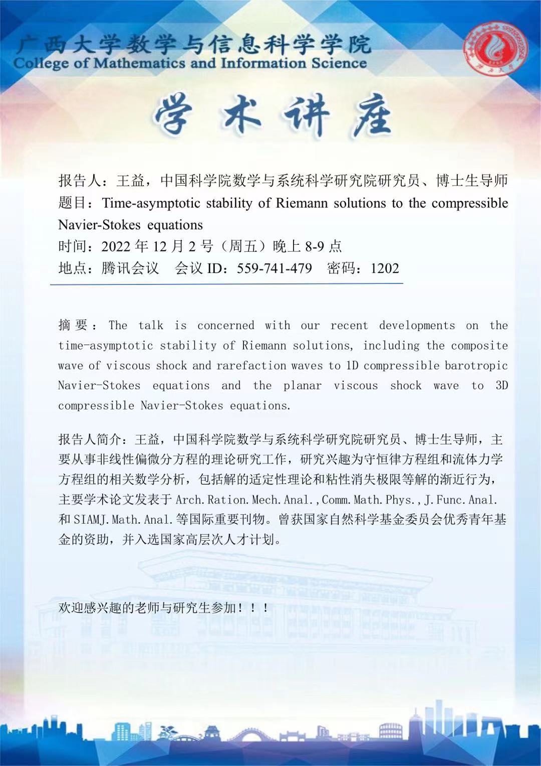 学术讲座:Time-asymptotic stability of Riemann solutions to the compressible Navier-Stokes equations