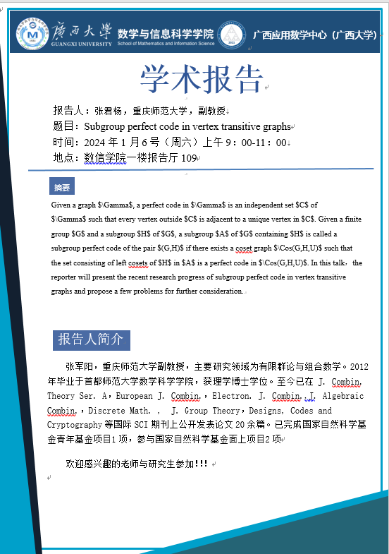 太阳集团2138网址:Subgroup perfect code in vertex transitive graphs