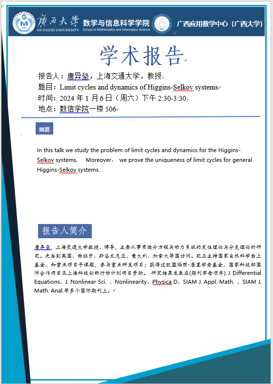 太阳集团2138网址:Limit cycles and dynamics of Higgins-Selkov systems