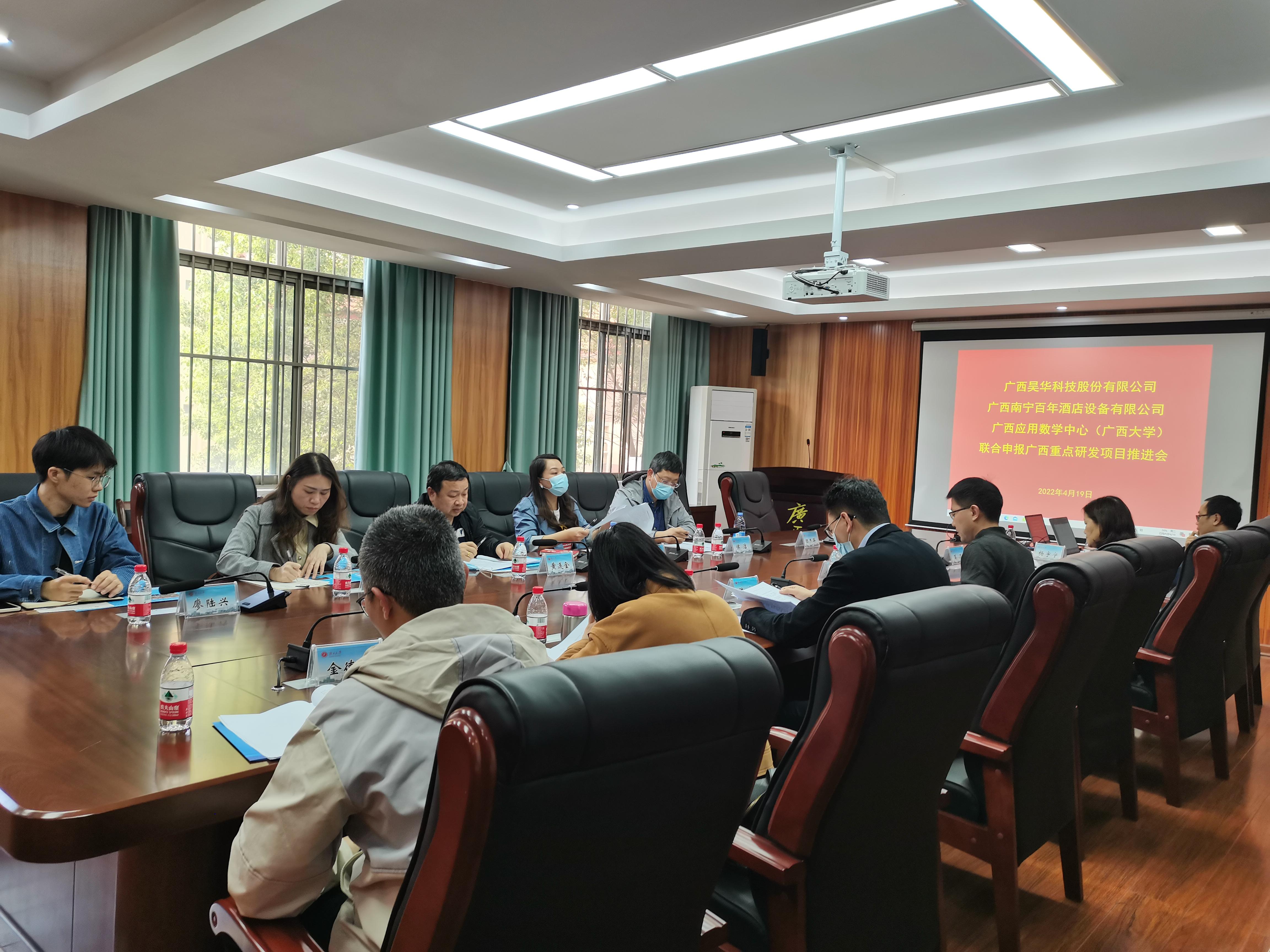 2022年4月19日,广西昊华科技股份有限公司、广西南宁百年酒店设备有限公司和广西应用数学中心(广西大学)在广西大学太阳集团2138网址,2138cc太阳集团官网入口召开联合申报广西重点研发项目推进会。广西南宁百年酒店设备有限公司总经理黄连金、副总经理侯洁,广西优耐信息技术有限公司项目申报部经理梁晶,广西应用数学中心(广西大学)常务副主任、广西大学太阳集团2138网址,2138cc太阳集团官网入口副院长袁功林,广西应用数学中心(广西大学)团队负责人等参加了此次会议。