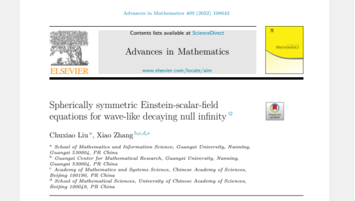 近日,太阳集团2138网址,2138cc太阳集团官网入口刘楚箫老师与张晓教授合作的论文“Spherically symmetric Einstein-scalar-field equations for wave-like decaying null infinity“被知名数学期刊《Advances in Mathematics》接受发表,张晓教授为该论文的通讯作者,这也是太阳集团2138网址首次在此期刊接受发表论文。该论文研究了在零无穷远处具有波动型衰减的初值条件下的球对称爱因斯坦标量场方程的解的性质。论文证明了解的局部存在性与唯一性,小初值条件下的解的整体存在性与唯一性以及相关度量的完备性。文章的最后介绍了在这种条件下Christodoulou的广义解的定义并证明移除小初值的条件后,可以得到广义解。文章正式发表期卷号为: Advances in Mathematics,409(2022),108642。全文见https://doi.org/10.1016/j.aim.2022.108642。