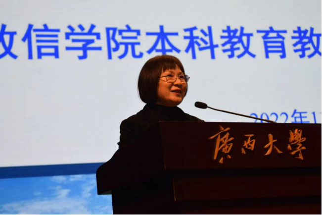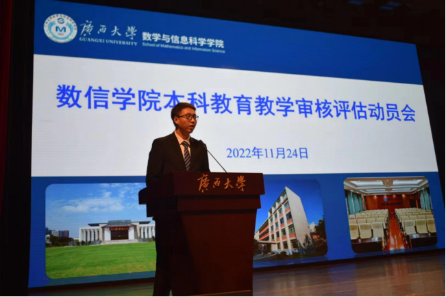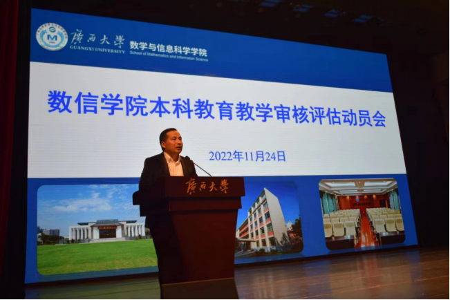 郭真华院长从“充分认识本科教育教学审核评估的重大意义”、“高度重视本次指导性评估工作”以及“我们学生如何做好迎评工作”三个方面做了动员讲话,对评估工作的背景意义要求以及目前工作情况进展情况做了介绍,指出做好本科教育教学审核评估指导性评估是当前学校学院的一件大事、要事,与广西大学的发展和个人的成长成才都息息相关。希望各位同学树立与学校学院荣辱与共的“共同体”意识,用好学院编制下发的《本科教育教学评估学生应知应会问题》,准确掌握校情、院情,做到人人参与评估,发挥好党员、学生干部的先锋模范作用,把评估工作落到实处,并以此评估工作为契机,以更严谨的学风、更严格的纪律要求、更加饱满的精神状态投入到学习生活当中。
