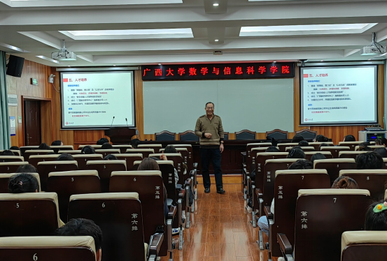 随后,李靖建教授向同学们介绍了数学与应用数学专业的基本情况。李老师从数学与应用数学的专业特点、学院师资力量、培养目标、知识体系、学生后续发展等方面向同学们做了生动、活泼的专业介绍。