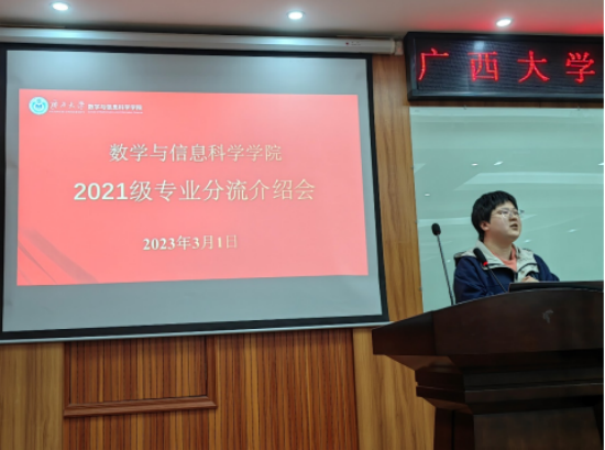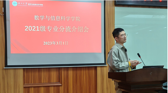 阳春三月,万物复苏。根据学校关于“关于做好2021级大类招生专业分流工作的通知”要求,为更好地做好学院2021级专业分流工作, 2023年3月1日,太阳集团2138网址在109报告厅召开了2021届专业分流介绍会,数学与应用数学系主任李靖建教授、信息与计算科学系副主任徐洁琼教授、数学类211班班主任刘楚箫博士、数学类212班班主任张幸博士及2021级数学类全体本科生参加本次分流专业介绍会。