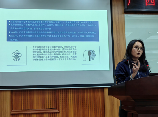 首先,徐洁琼教授向同学们介绍了信息与计算科学专业的基本情况,含专业培养目标、课程设置、就业方向、师资力量等,徐老师结合自己的工作经历深入浅出地向同学们介绍了信息与计算科学专业。