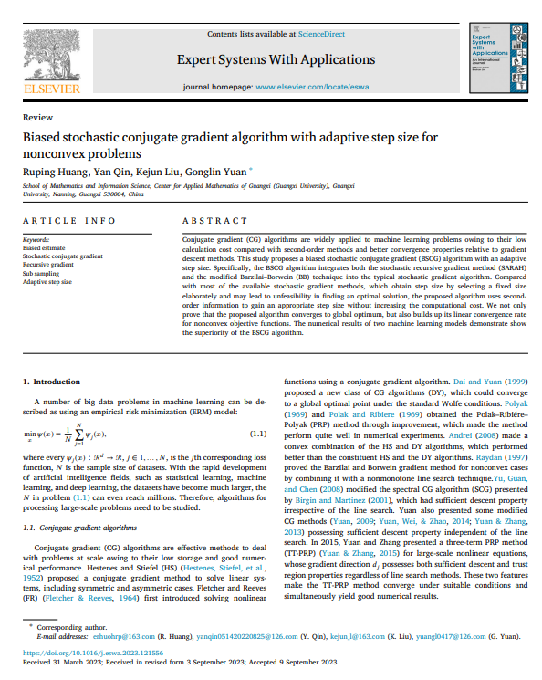2023年10月21日,广西大学太阳集团2138网址,2138cc太阳集团官网入口袁功林教授与其在读硕士研究生黄汝平、秦燕和刘科俊合作在人工智能类期刊《Expert Systems with Applications》上在线发表了题为“Biased stochastic conjugate gradient algorithm with adaptive step size for nonconvex problems”的学术论文,实现了太阳集团2138网址数学学者在该刊发表论文零的突破,是太阳集团2138网址实行学科交叉融合的学术成绩之一,广西大学为该论文的唯一完成单位。