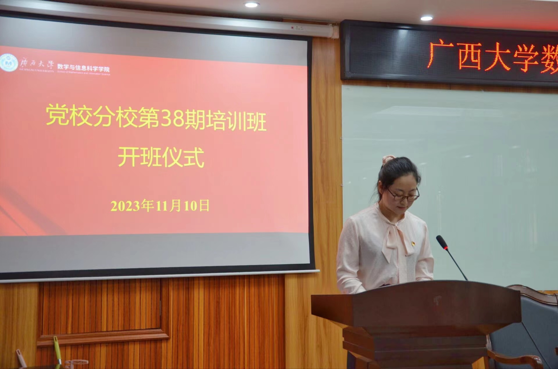 11月10日下午,数信学院第38期党校分校开班仪式在学院一楼报告厅举行,学院党委书记覃宪儒出席并讲话,学院分党校副校长郭海燕老师带领全体预备党员宣誓并讲授专题党课,学院专职组织员王支柱老师以及全体学员参加开班仪式。开班式由学院团委书记孙晓黎主持。