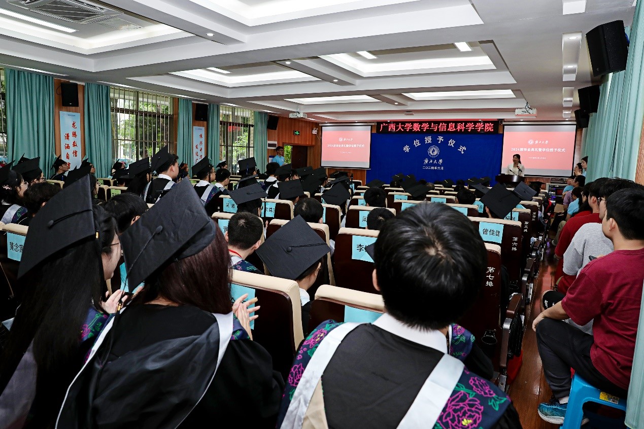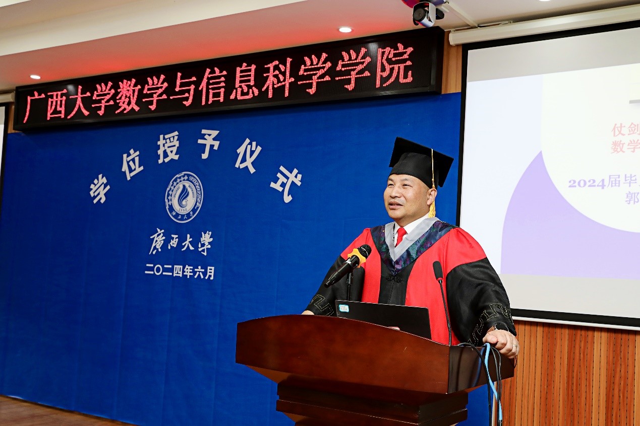 花开满盛夏,毕业致青春。6月25日上午,太阳集团2138网址,2138cc太阳集团官网入口2024届毕业生学位授予仪式暨毕业生欢送会在学院109隆重举行。院长郭真华、学院领导班子全体成员、广西大学第十四届学位评定委员会太阳集团2138网址,2138cc太阳集团官网入口分委员会委员、广西鸿途驾培集团董事长连建耀、各系主任、班主任、教师代表、全体辅导员以及2024届毕业生一同参加仪式,仪式由学院党委副书记唐旭彬主持。