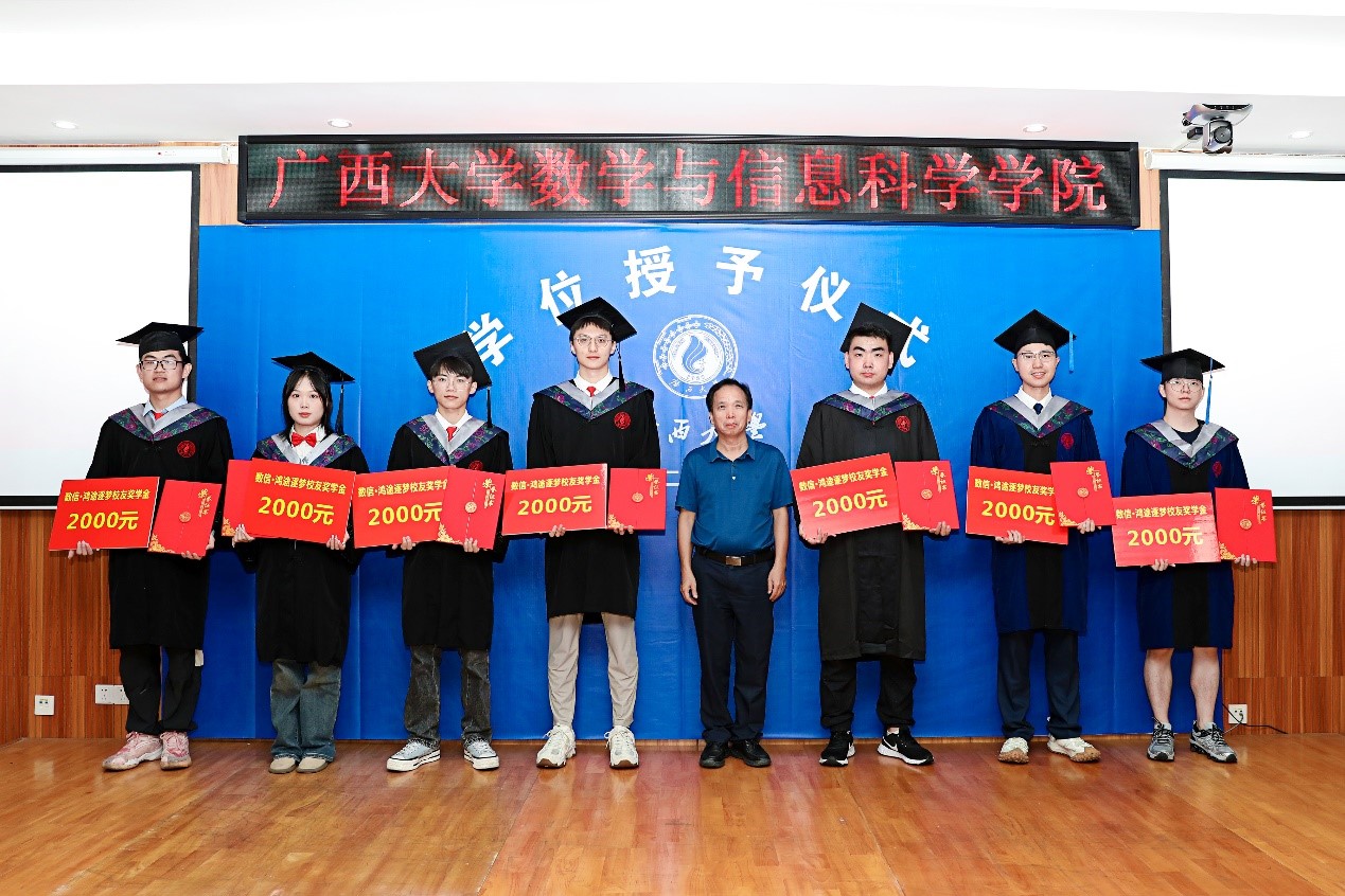 广西鸿途驾培集团董事长连建耀先生为获得广西大学太阳集团2138网址,2138cc太阳集团官网入口第一届“数信·鸿途逐梦”校友奖学金的毕业生们颁奖并与获奖同学合影留念。在颁奖仪式后的讲话中,连建耀结合自己的创业经历和成功经验,给即将步入社会的大学生就如何尽快适应职场需要进行了指导。