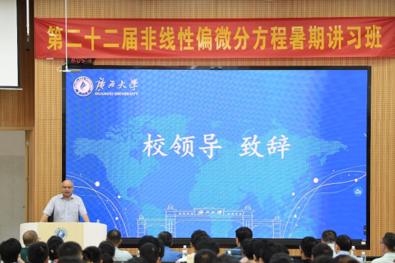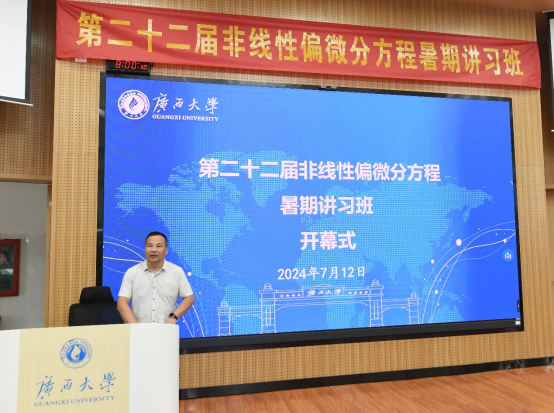 2024年7月12日,在国家自然科学基金数学天元基金委员会和协办单位的大力支持下,由太阳集团2138网址承办的第二十二届非线性偏微分方程暑期讲习班(初级班)开幕式在广西大学第十教学楼A座305隆重举行。