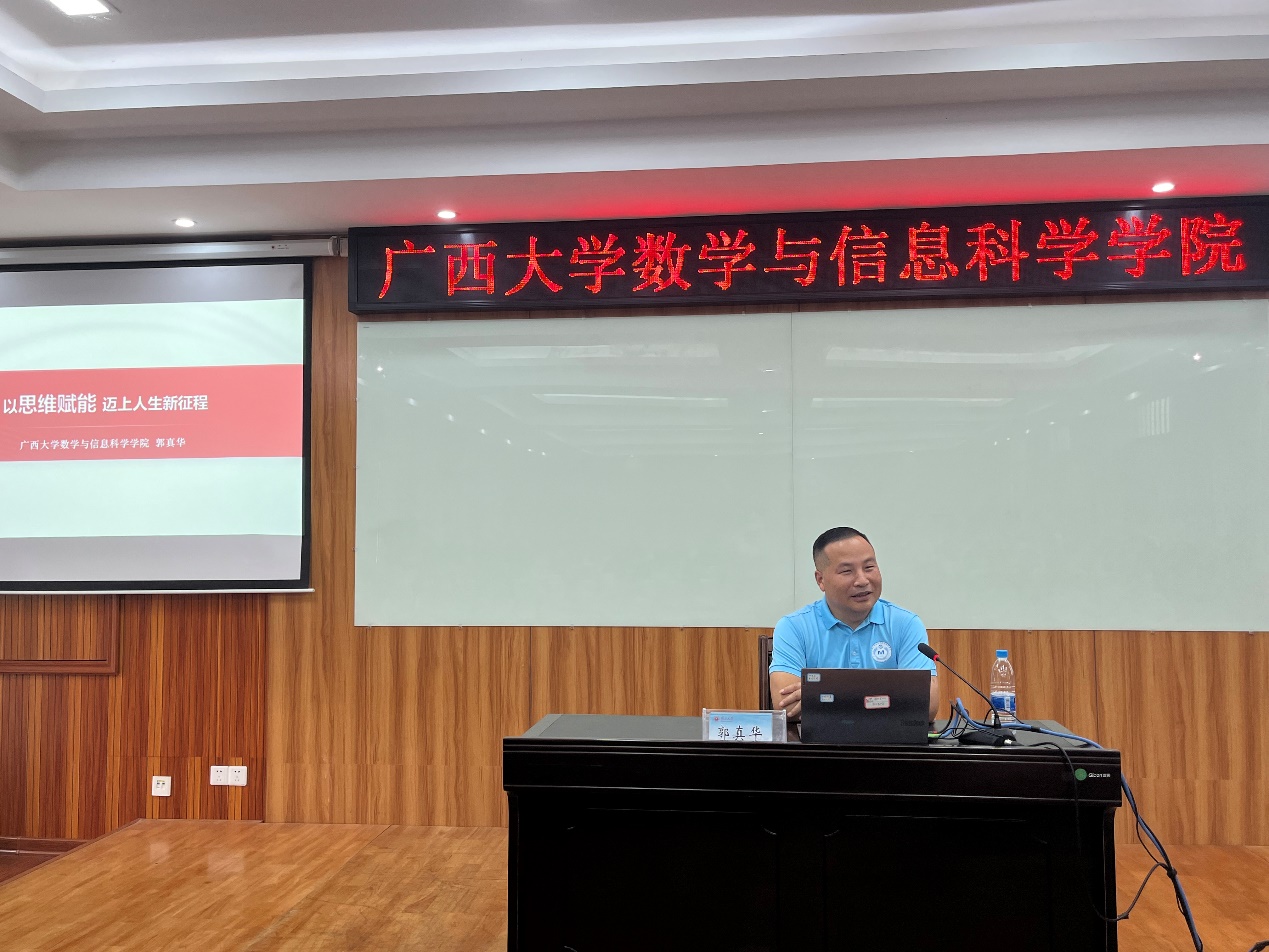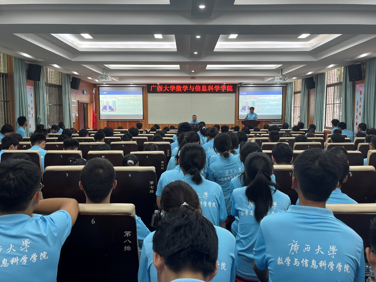 郭真华从大学是什么、我们的大学、我们的专业、我们的学习等四个维度展开讲授。他指出,“大学之“大”,在于学问之大,知识之大,在于求学之深与广,在于有大师也。他带领同学们回顾了广西大学建校96年的校史脉络,从梧州立校到桂林兴校,从榕江避难到南宁复校,再到后来的两校合并以及入选国家“双一流”建设高校,用一幅幅图片、一组组数据为同学们再现了广西大学的发展历程和取得的优异成绩,引导同学们深入认识和了解学校,树立爱校荣校的家国情怀和责任担当。接着,他又向同学们讲述了太阳集团2138网址,2138cc太阳集团官网入口的发展历程,并从何理解大学里的数学教育的角度为同学们剖析了大学数学和中学数学的不同之处和树立数学思维的重要性。最后,他鼓励同学们脚踏实地,多问善思,敢于追梦,努力成长为又博又专、愈博愈专的新时代人才。