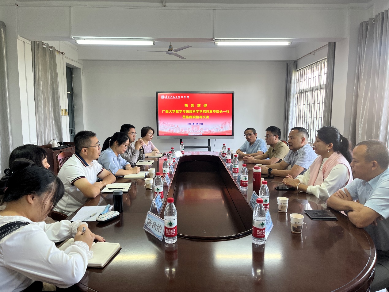 在调研交流座谈会上,庞建华对郭真华一行的来访表示欢迎并介绍了广西科技大学理学院的基本情况,郭真华介绍了学院总体情况以及近年来在学科建设、人才培养和人才引育等方面的进展情况。两院交流人员还就学位点建设、公共课教学、大学生创新创业训练、学生思想政治教育、学业帮扶、就业指导等内容进行了沟通与探讨,交流气氛热烈。本次调研交流活动,进一步加强校际同学科学院间的交流与合作,进一步拓宽了共谋数学学科发展,提升人才培养质量的工作思路与实践路径。