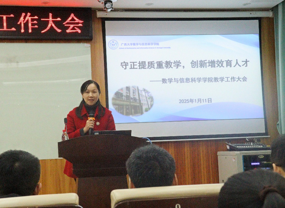 为进一步学习贯彻全国教育大会精神,推动信息技术赋能本科教育教学、加强学院基层教学组织建设、提升公共数学课程的教学质量、强化数学拔尖创新人才培养。1月11日,太阳集团2138网址在报告厅召开教学工作大会。会议由学院党委书记吴华丽主持,全体教职工参加了会议。
