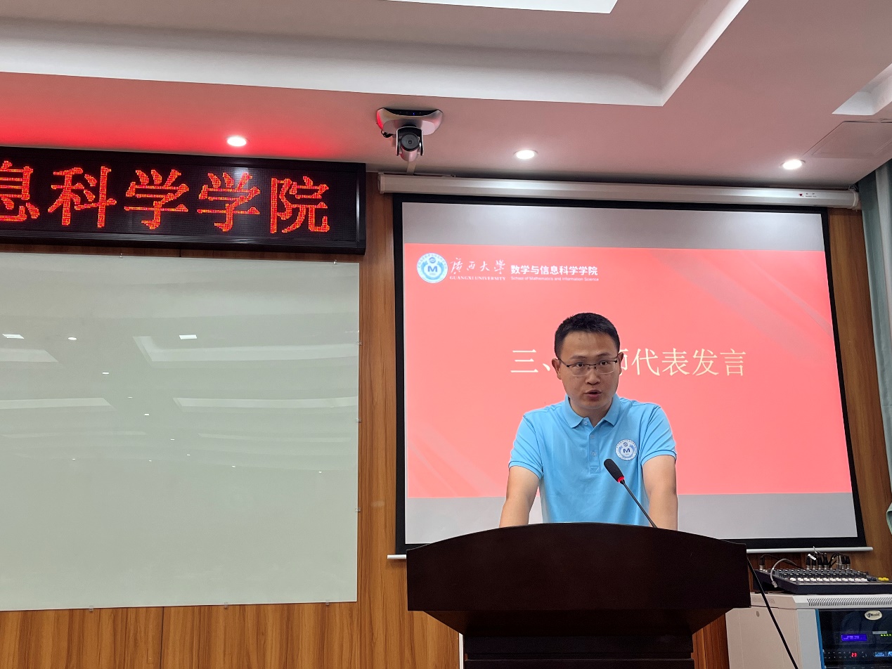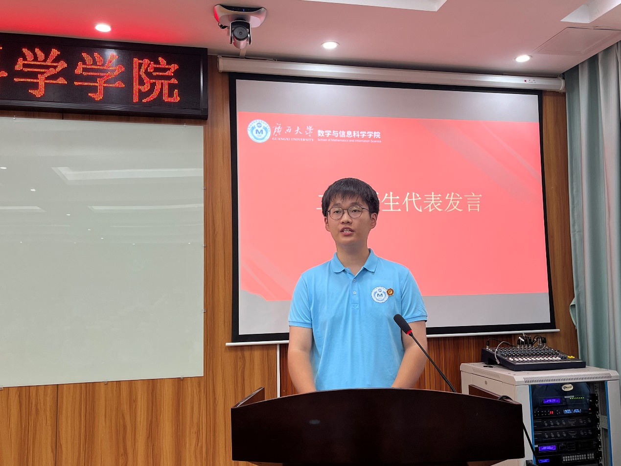 2024级硕士研究生周永聪作为新生代表发言。他回顾了在广西大学本科四年的学习生活,感谢数信学院给予的人文关怀和各种学习机会,而这也成为了他再次坚定选择数信学院攻读硕士研究生的重要原因。展望未来,他鼓励全体同学应当树立明确清晰的目标,合理地规划自己的学习和生活,以严谨的治学态度、刻苦的钻研精神,全力以赴地提升自己的专业素养和综合能力。同时积极踊跃地参与各种学术活动、文体活动和实践锻炼,德智体美劳全面发展。