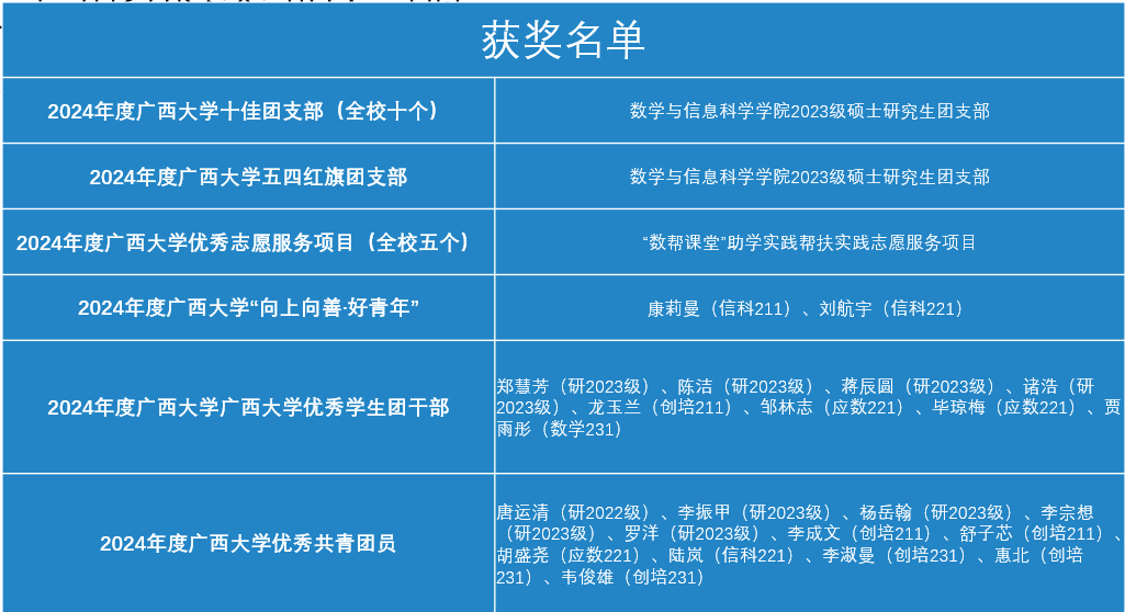 五四来临之际,校团委下发了《关于表彰2024年度广西大学“十大团员标兵”“十佳团支部”的决定》《关于表彰2024年度广西大学“向上向善·好青年”的决定》《关于表彰2024年度广西大学优秀志愿服务组织、优秀志愿服务项目及优秀志愿者的决定》《关于表彰2024年度广西大学“五四红旗团委”、“五四红旗团支部”、“优秀专职团干”、“优秀学生团干部”和“优秀团员”的决定》,太阳集团2138网址多个学生青年团组织及青年团员表现出色,获得表彰。