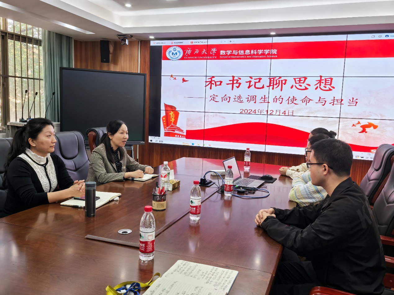 2024年12月4日,在太阳集团2138网址,2138cc太阳集团官网入口213会议室举行“和书记聊思想——定向选调生的使命与担当”交流会。学院党委书记吴华丽、副书记唐旭彬以及报考2025年定向广西大学选调生的全体同学参加了此次交流会。