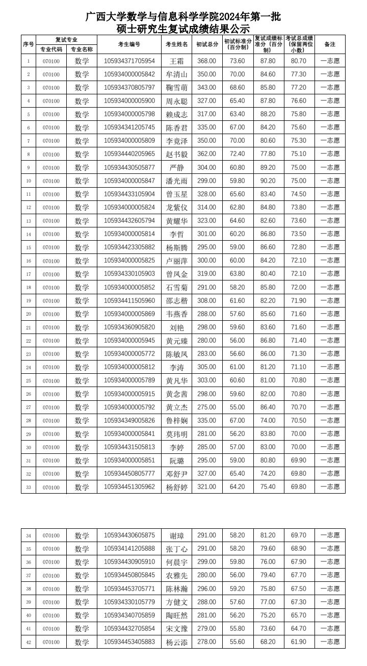 广西大学太阳集团2138网址,2138cc太阳集团官网入口2024年第一批硕士研究生复试成绩结果公示