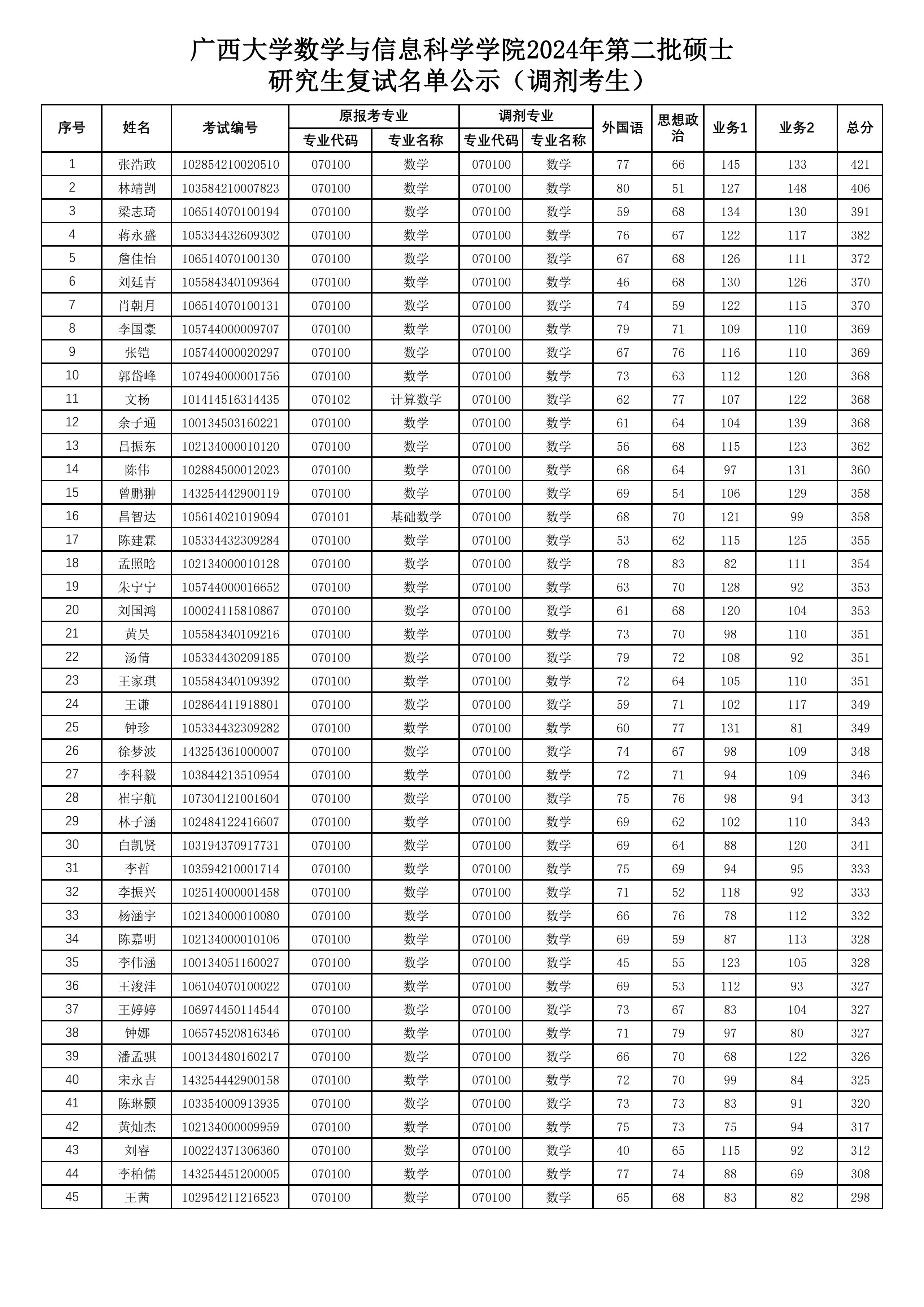 广西大学太阳集团2138网址,2138cc太阳集团官网入口2024年第二批硕士研究生复试名单公示(调剂考生)