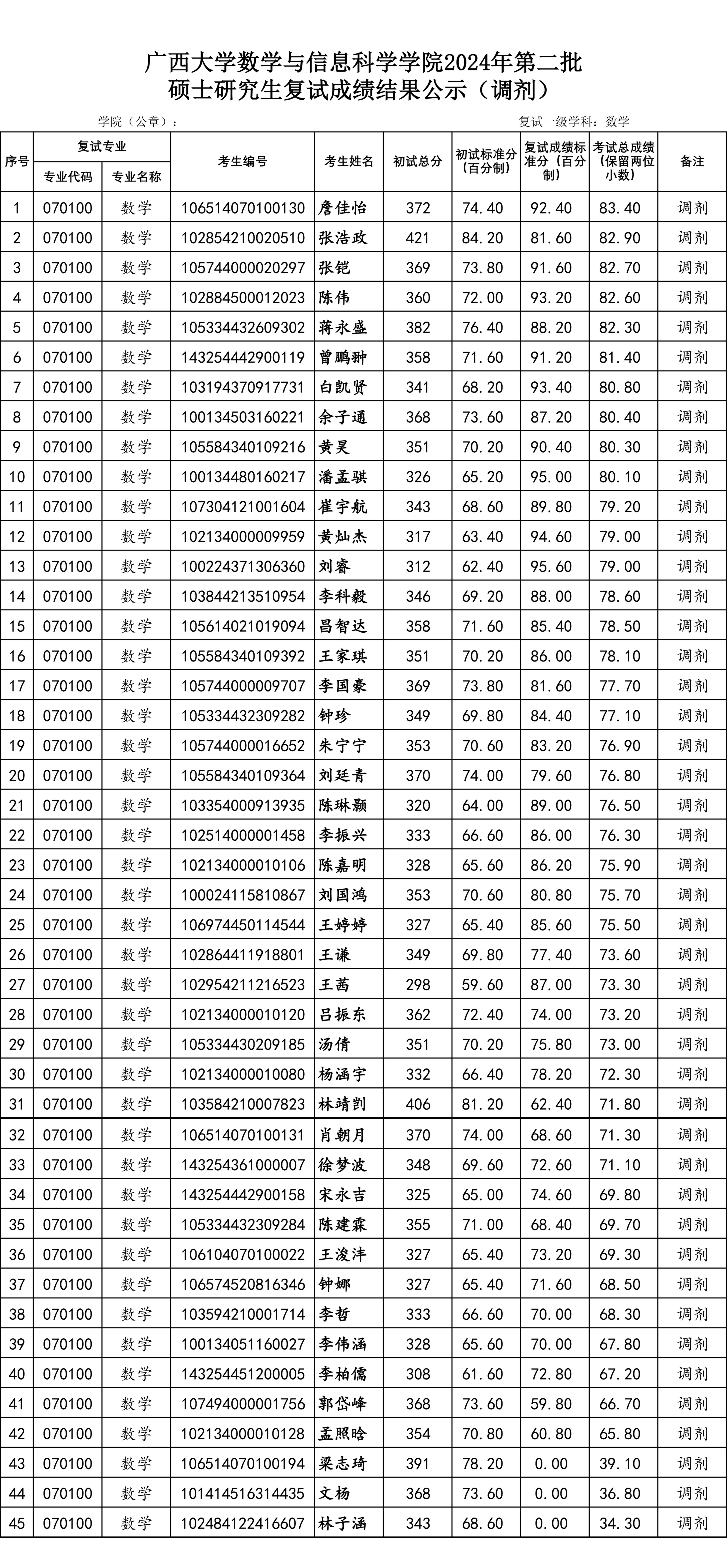 广西大学太阳集团2138网址,2138cc太阳集团官网入口2024年第二批硕士研究生复试名单公示(调剂考生)