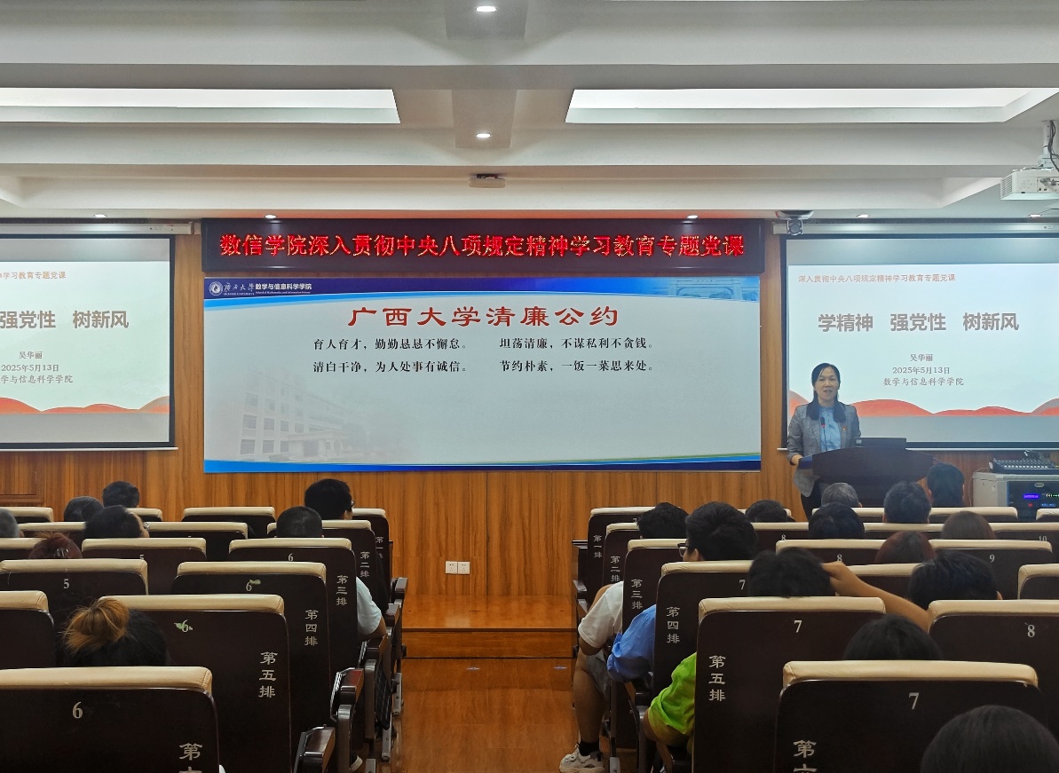 5月13日下午,院党委书记吴华丽以“学精神 强党性 树新风”为题,为太阳集团2138网址100余名师生党员讲授深入贯彻中央八项规定精神学习教育专题党课。