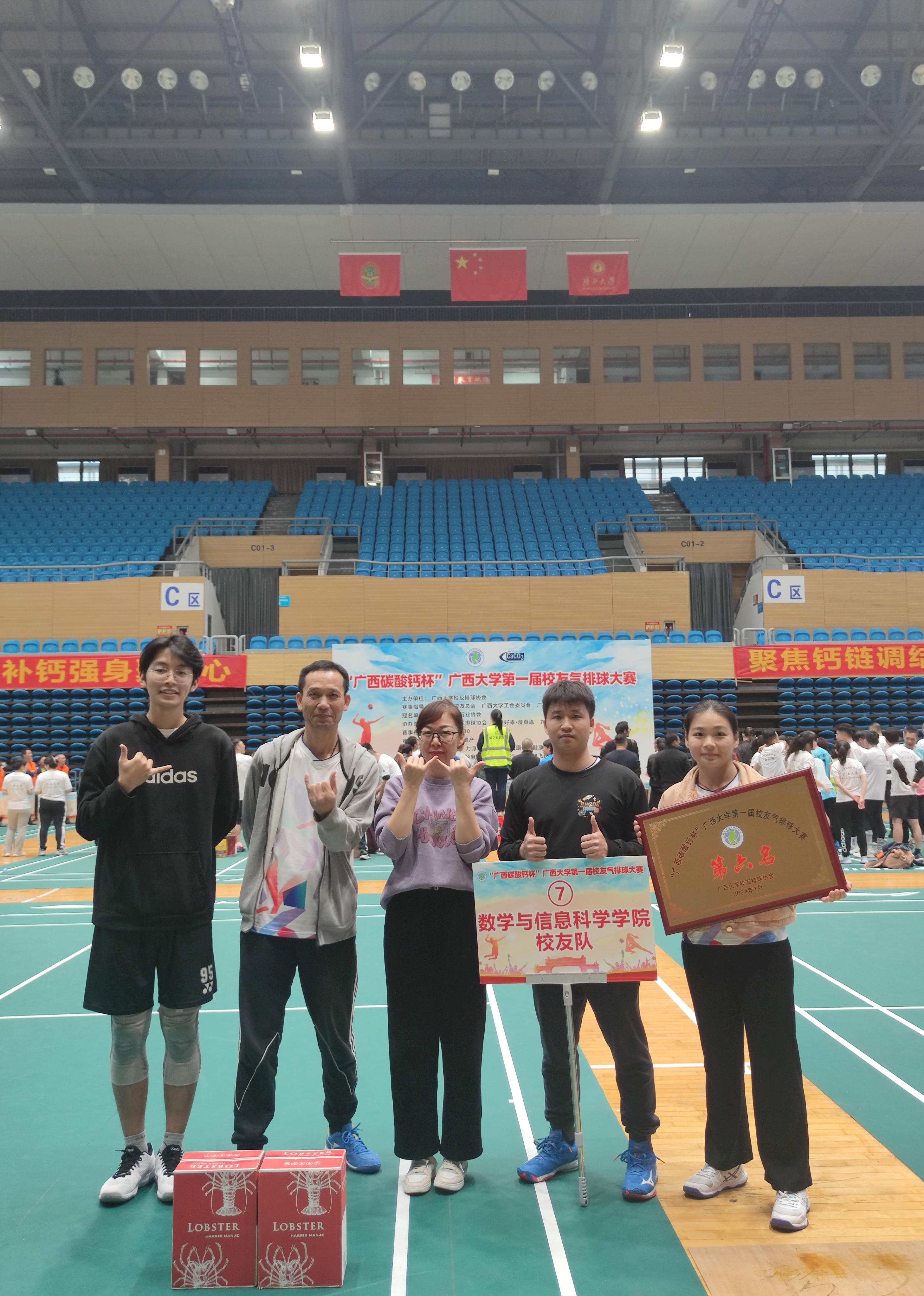 1月6、7日,“广西碳酸钙杯”广西大学第一届校友气排球大赛在广西大学西校园体育馆举行。太阳集团2138网址,2138cc太阳集团官网入口校友气排球队一路斗志昂扬、奋勇拼搏、团结协作,最终取得了第六名的好成绩。数信学院副院长石志刚、团委书记孙晓黎等老师到场指导并观看比赛。